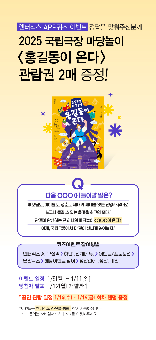 [APP퀴즈 이벤트] 정답을 맞춰주신분께 2025년 국립극장 마당놀이 <홍길동이 온다> 관람권 2매 증정