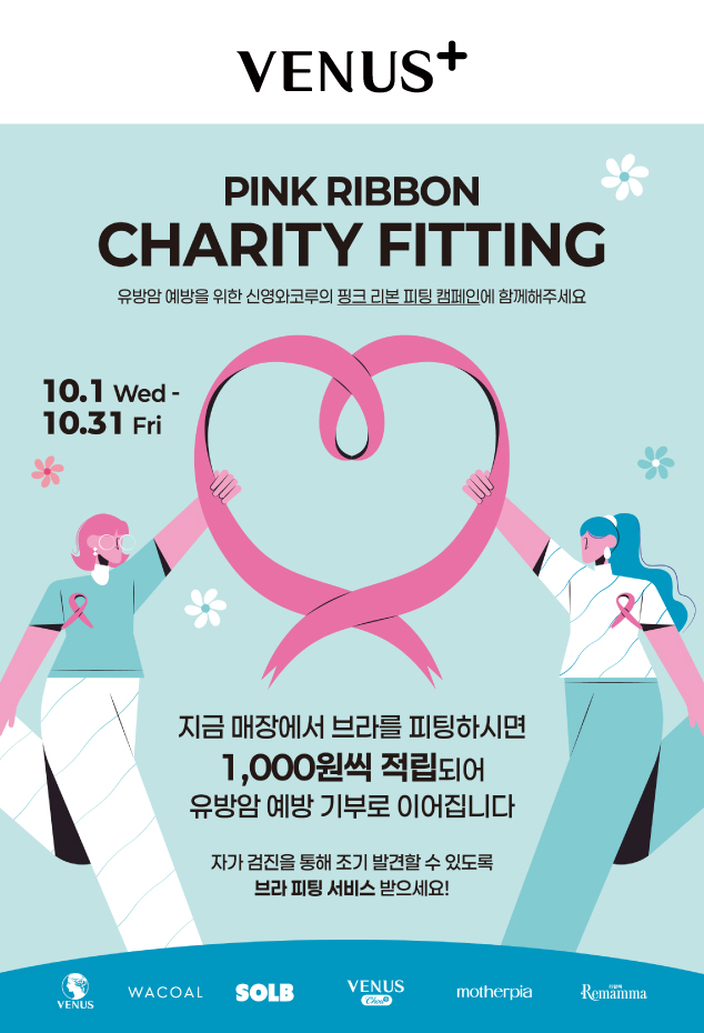 상봉점 SALE 프로모션 [비너스+] 등록일2025.09.30 [비너스+] 핑크리본 피팅 캠페인-피팅 시 캠페인 1,000원 기부 최초 피팅 시 1,000 포인트 적립*대상: 통합 멤버십(신규/전환)가입고객*2층 브랜드 본 매장